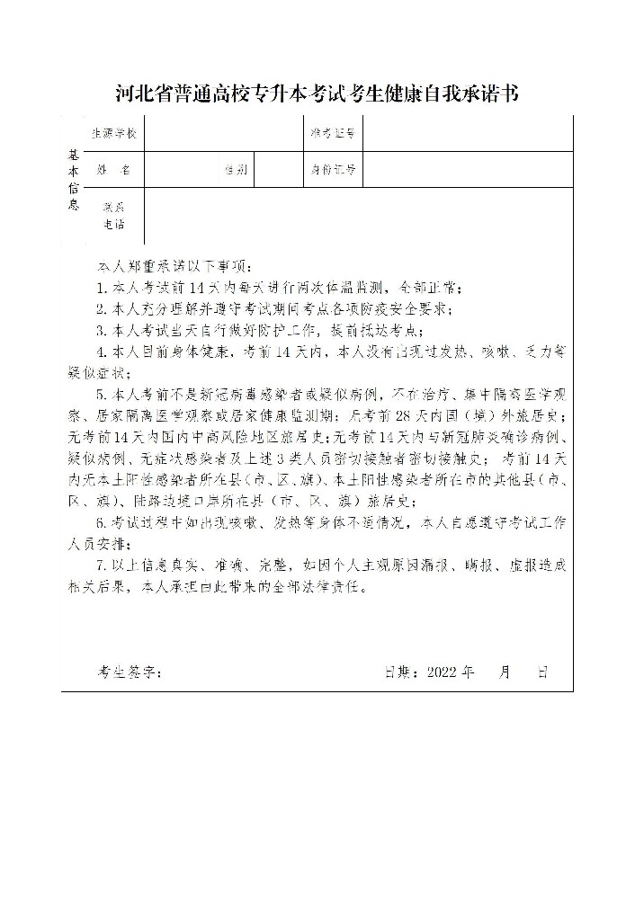 二、考试材料要带齐。考生在考试当日应提前60分钟到达考点,服从监考员及考点工作人员管理,每场考试入场均须提供考前一天彩色打印的“河北健康码”、“通信大数据行程卡”、有效居民身份证、准考证、7日内和48小时内两次核酸检测阴性证明(两次核酸检测采样时间至少间隔24小时)、本人签字的《河北省普通高校专升本考试考生健康自我承诺书》(见附图)。